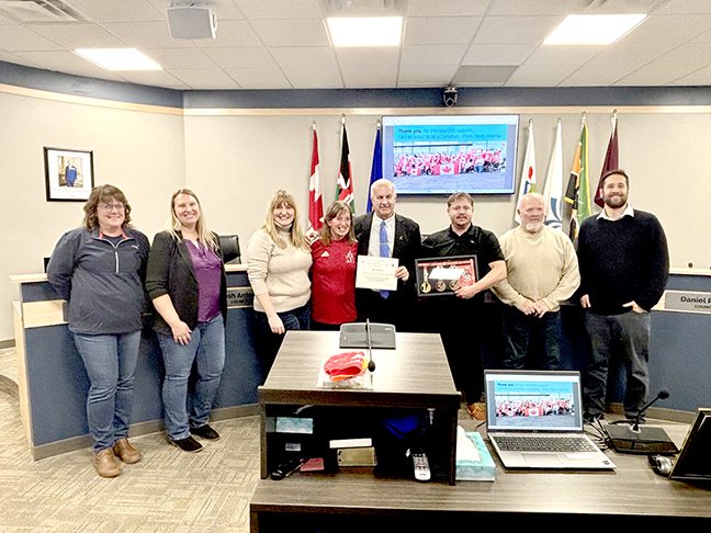 Times Photo Submitted by Town of Taber. HONOURARY: Jan Clemis (in red by Mayor Andrew Prokop) was honoured by town council on Nov. 24 after sharing her experiences at the World Transplant Games in Dresden, Germany last summer. By Cal Braid